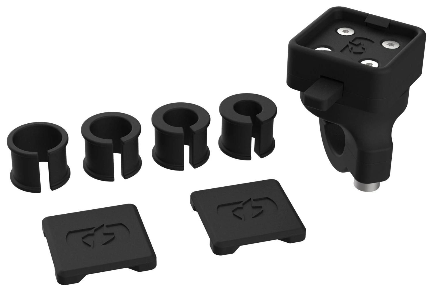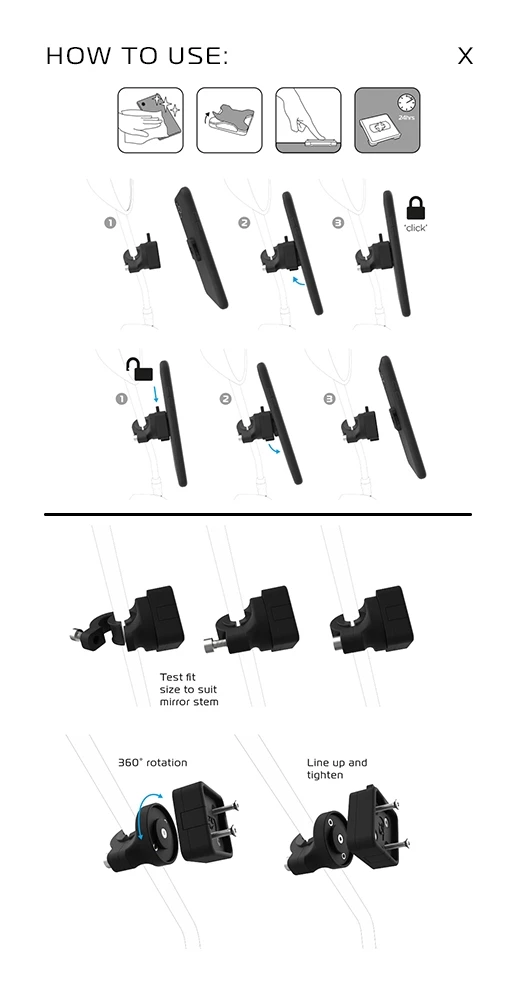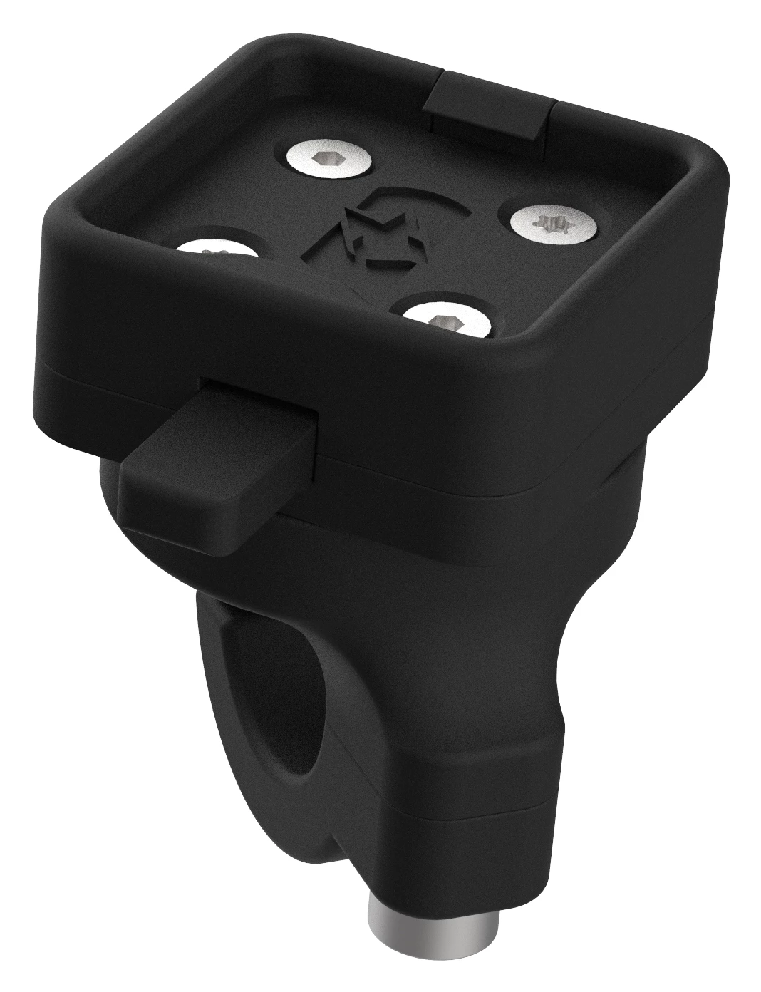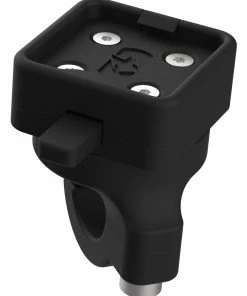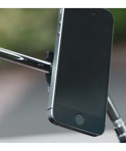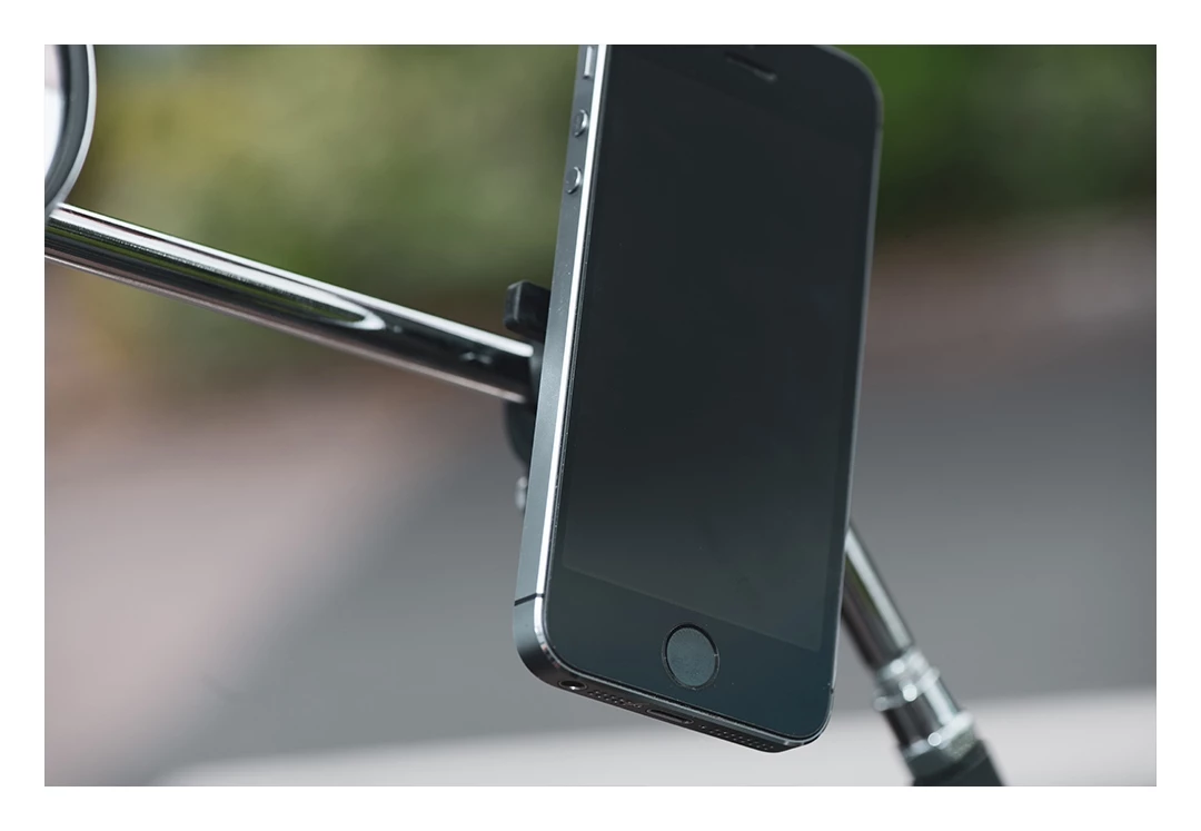 The Oxford CLIQR system consists of an adapter that adheres to the back of your phone and its corresponding base that ensures a rock-solid connection. Your phone securely clicks in, then clicks out. This mount is designed to hold most smartphones in a landscape or vertical orientation on bikes with round mirror posts.