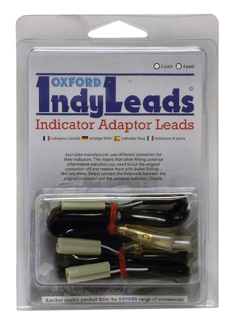 Each bike manufacturer uses different connectors for their indicators. This means that when fitting universal aftermarket indicators you need to cut the original connectors off and replace them with bullet fittings. Well, with Oxford’s Indy Leads, cutting your stock leads is a thing of the past. Simply connect the IndyLeads between the original connector and the universal indicator.Â